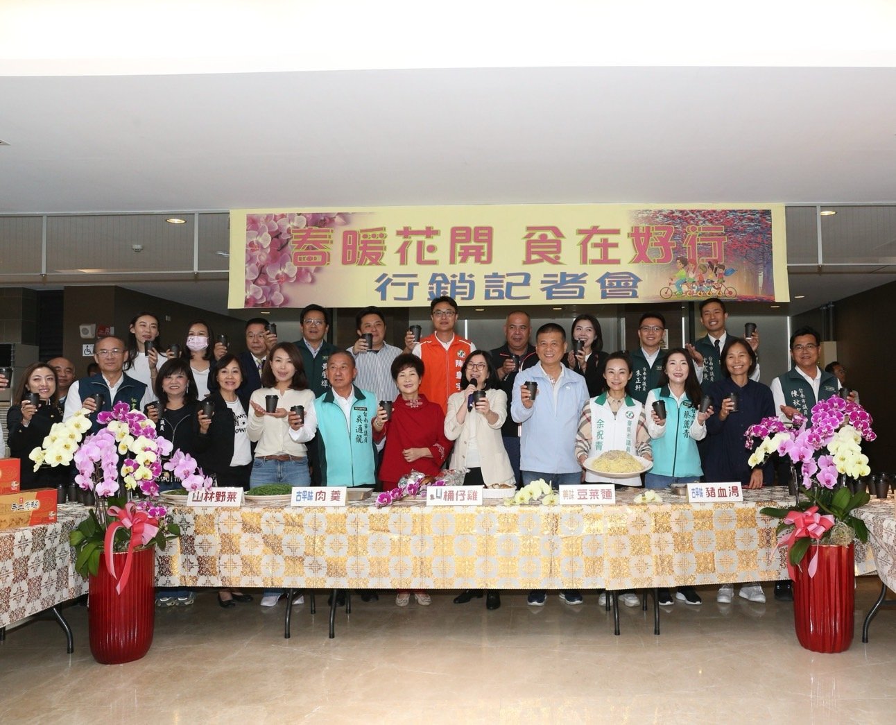 今日記者會準備了豆菜麵、豬血湯、肉羹湯、桶子雞及野菜等在地佳餚,並邀請東山咖啡產業發展協進會理事長郭雅聰介紹香醇的東山咖啡,並示範手沖咖啡,現場瀰漫濃濃咖啡香。