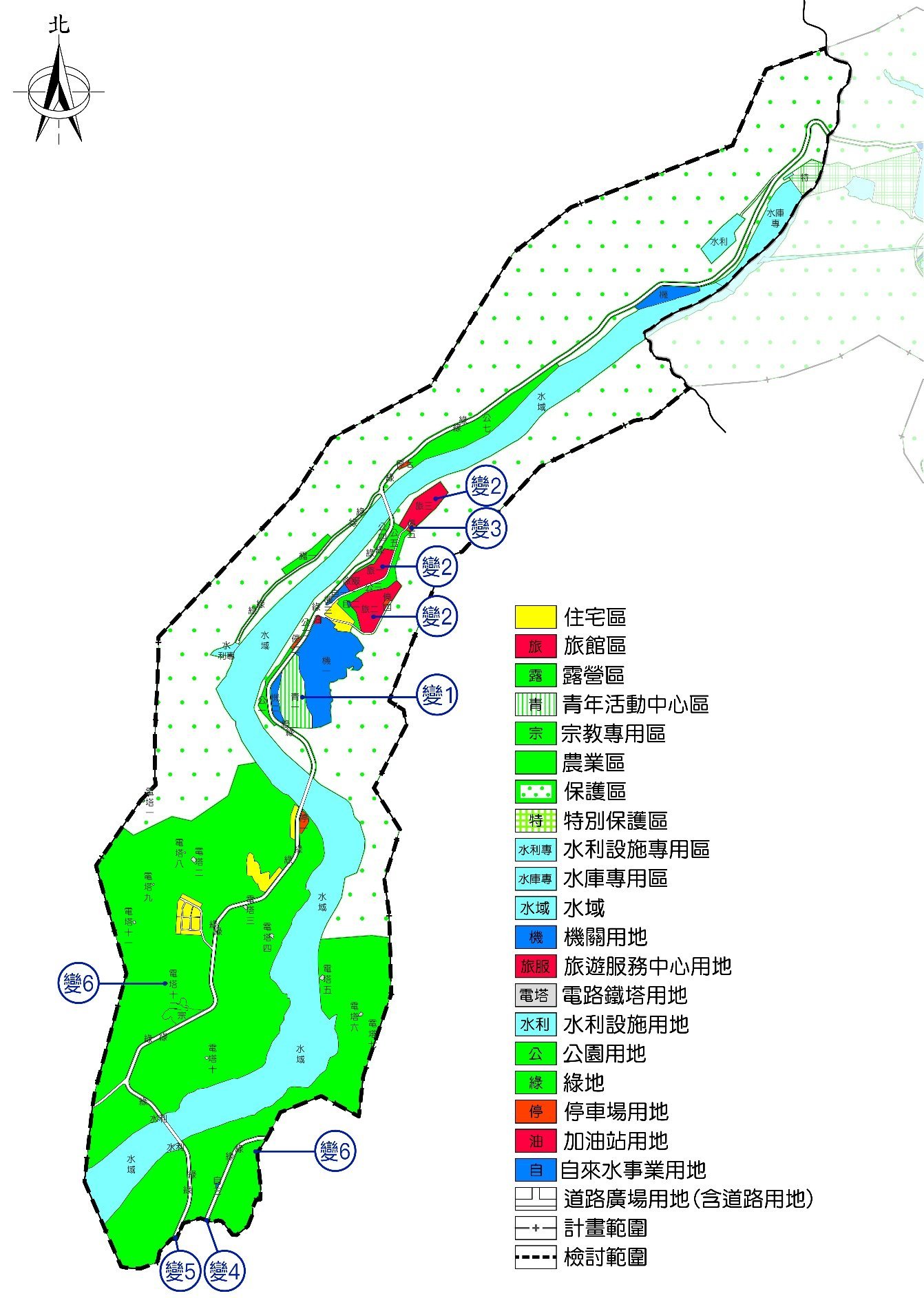 市府都發局長徐中強表示,本次檢討重點包含為因應觀光發展條例修正,以利住宿設施合法登記,將「青1」青年活動中心區及部分機關用地變更為「第一種旅館區」;另根據森林法將原計畫「旅館區」屬國有地部分變更為保護區,其餘則調整為「第二種旅館區」,爰變更後兩種旅館區之面積合計為16.55公頃。另配合通行交通現況於聯外道路部分,將3號道路(台3線)及4號道路(市174線)線型進行修正,以便與南側楠西都市計畫道路系統順接,已達到圖、地一致之目的。此外,為滿足未來台電公司供電需求,將農業區變更為電路鐵塔用地,以符土地管用合一。