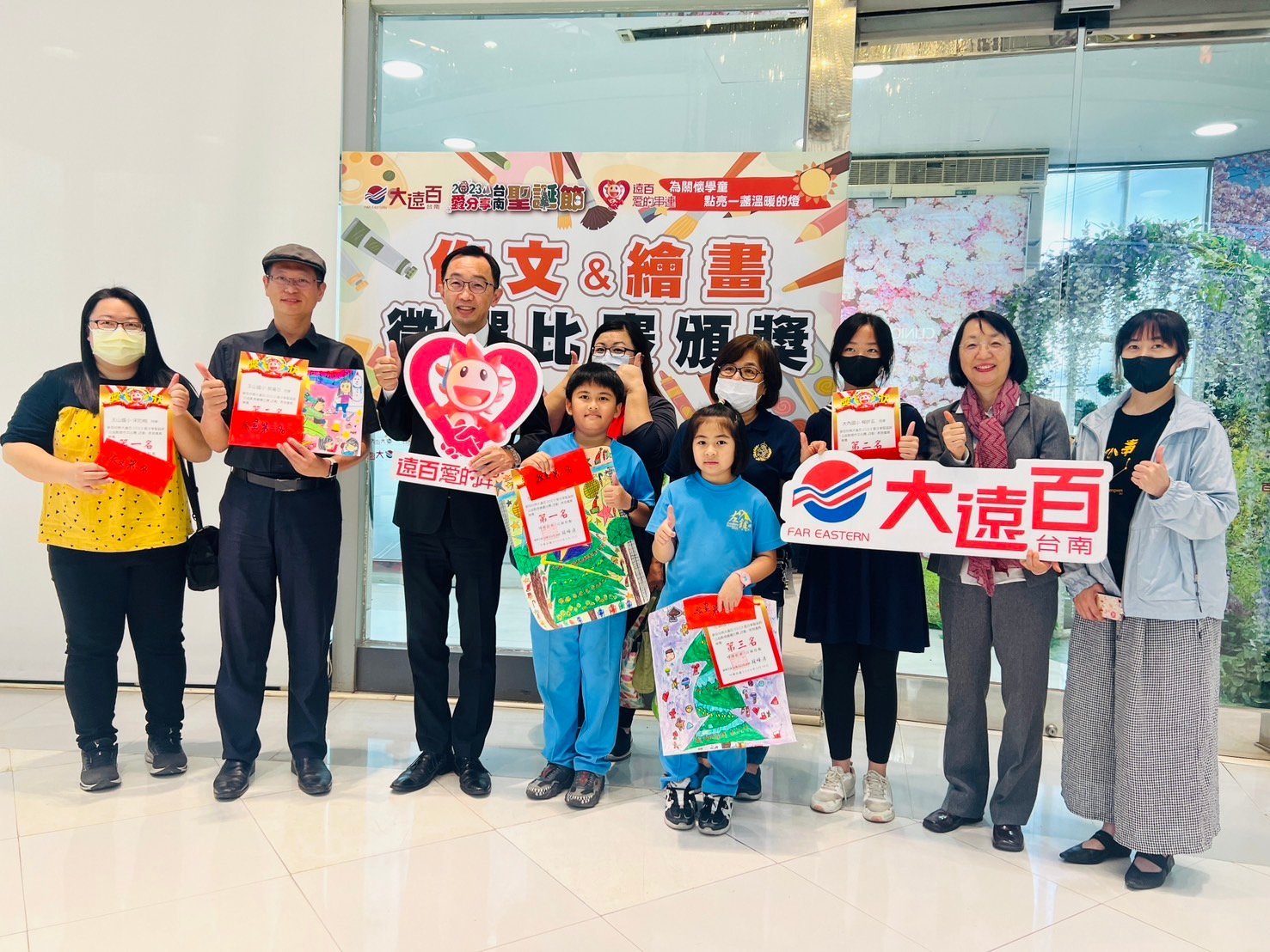 【透傳媒記者杜忠聰/臺南報導】台南大遠百連續十五年舉辦耶誕公益點燈活動,鼓勵參與學童將活動過程、美好回憶,透過文字、繪畫留下紀錄。此次參加作文、繪畫比賽前三名小朋友,十八日下午在台南大遠百,接受副理徐聖彬頒獎表揚。