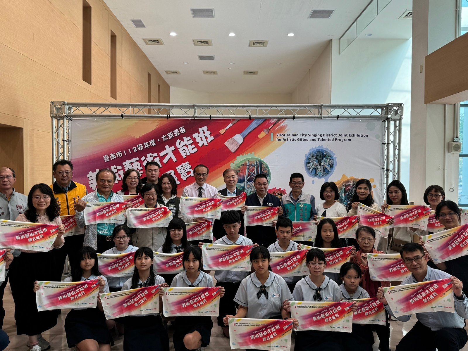【透傳媒記者杜忠聰/臺南報導】南市新進國小、月津國小和南新國中美術藝才班聯合美展,於3月15日至3月31日在新營區文化中心文物陳列室、第三畫廊及雅藝館等三個展場,由66名學生展出超過300件優秀作品。20日召開成果發表會,由教育局王崑源副局長代表黃偉哲市長到場致詞,邀請市民朋友一起來共賞這群年輕藝術家極具巧思的多元藝術創作。展覽結合龍年及臺南400意象,各展場安排學生進行專業導覽解說,讓來賓更瞭解每件作品創作的發想與亮點。