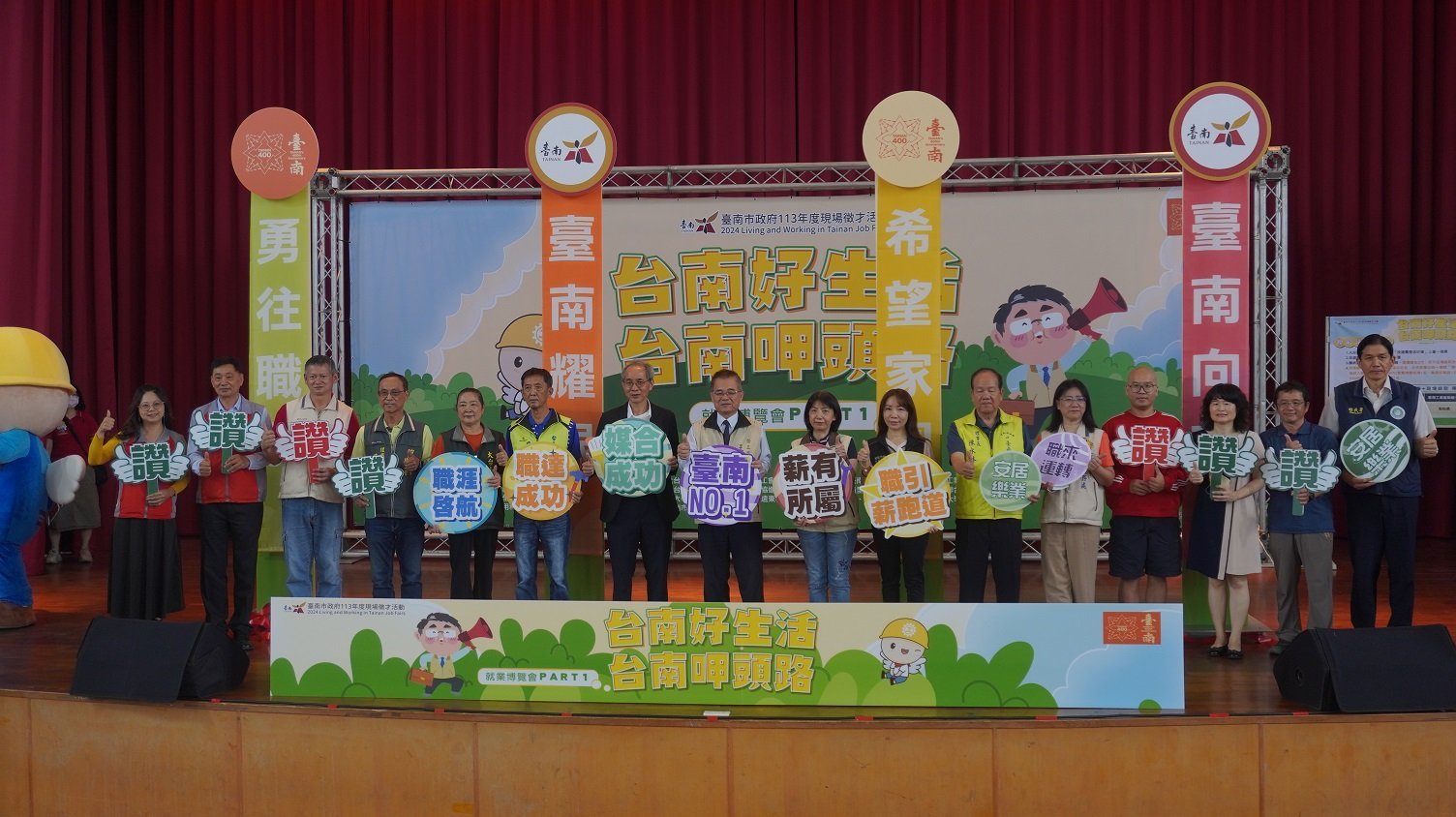 今日就博會由市長黃偉哲、立法委員郭國文、臺南市議會副議長林志展、勞工局長王鑫基、國家科學及技術委員會南部科學園區管理局副局長李信昌、國軍退除役官兵輔導委員會臺南市榮民服務處副處長羅婷婷、內政部移民署南區事務大隊臺南市第二服務站主任胡鵬翔、勞動部勞動力發展署雲嘉南分署永康就業中心主任李奇玫、台南市總工會理事長陳水林、台南市產業總工會理事長宋照濱、臺南市直轄市總工會理事長黃江福、大台南總工會副理事長陳美靜、台南市職業總工會祕書長吳允昌、社團法人台南市勞工志願服務協會理事長梁志男、台南市中小企業榮譽指導員協進會會長錢明華、中華民國髮藝美容造型技術指導員職業工會全國聯合會常務理事林尉民、統一超商股份有限公司區顧問蔡金祝、李偉智議員服務處秘書洪堯璁等貴賓藉由就業博覽會的媒合平台,共同祝福求職民眾,順利求職成功,在台南呷頭路、過好生活。