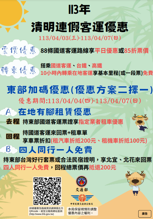 一、全國性客運優惠措施(113年4月3日0時至113年4月7日24時):