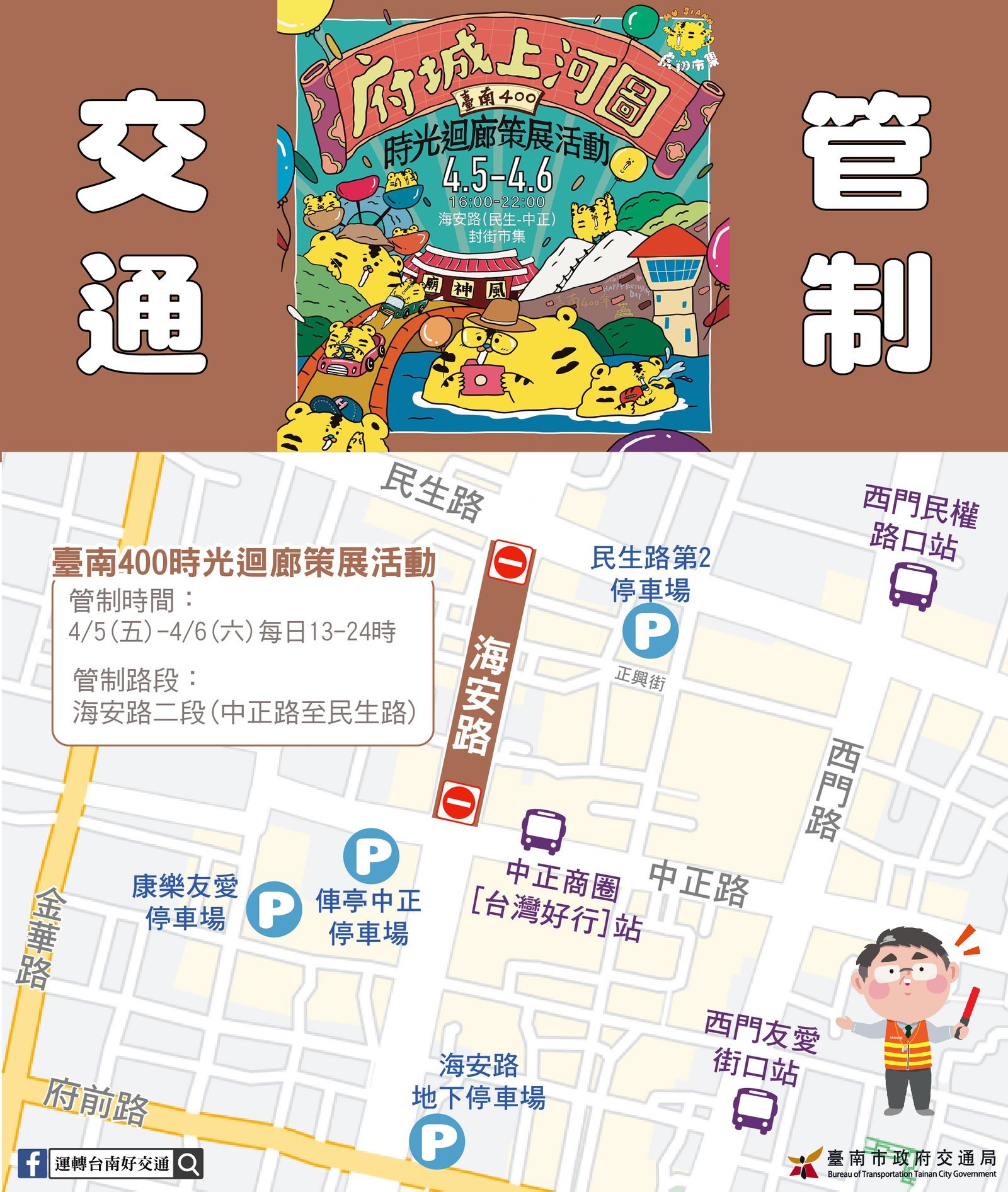 夢想遊樂園,水交社兒童節市集於5日至6日舉辦,活動期間將影響西門路、南門路及健康路等路段;中西區海安路二段、萬昌街連假期間也有商圈活動,請來往東西向民眾多利用府前路(市道182線)及中華東路、中華南路(1),來往南北的民眾多利用中華西路(台17線)及金華路(17甲線)