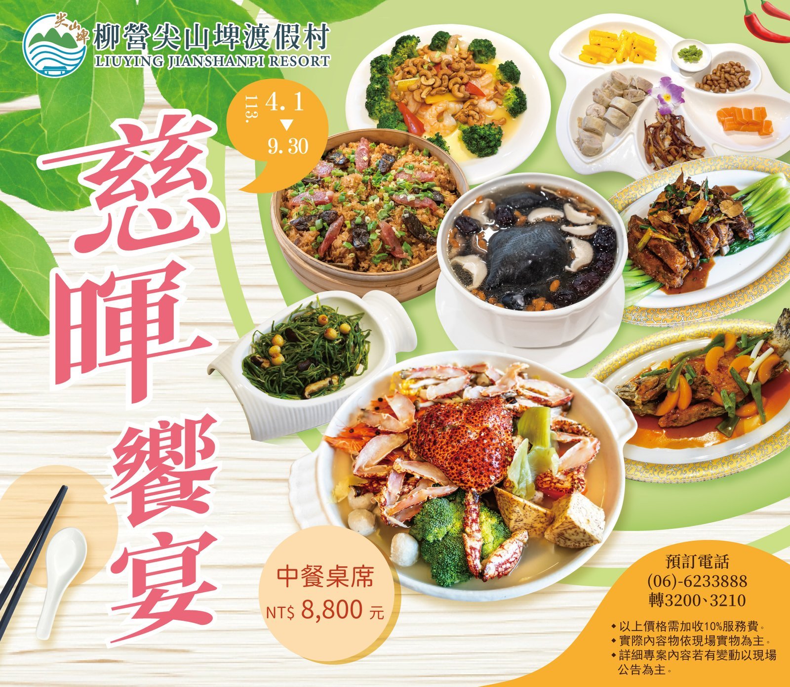 為滿足母親節訂餐需求,尖山埤自5月1日至5月12日推出「訂慈暉餐送烘咖啡體驗」活動,活動期間預訂$8,800以上桌菜,每桌贈送烘咖啡課程體驗券2張、精美康乃馨1束及免收入園門票,參加「烘咖啡體驗課程」可以陪伴媽媽親手做一杯手工咖啡,包含咖啡豆烘焙、研磨、沖泡及包裝,並且可帶回專屬的咖啡濾掛包,共度充滿咖啡香的幸福時光。訂餐專線06-6233888分機3100洽餐飲部。