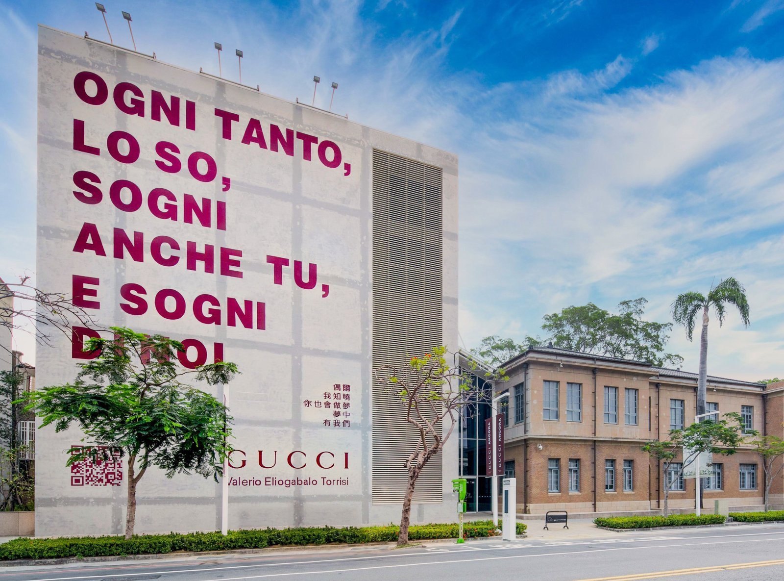 此次臺南巡迴為加深義大利時尚之都米蘭與臺灣在地文化深度連結,Gucci特別邀請義大利米蘭新銳藝術家 Valerio Eliogabalo Torrisi 以「文字」進行創作,並委任本月剛獲得「臺北電影節卓越貢獻獎」肯定的臺南之光—國寶級畫師顏振發師傅與臺南當地藝術家蔡濰任共同協作,於南美館1館外牆打造出這座臺灣首次曝光、堪稱全臺史上最大手繪巨幅文字藝術牆。此幅藝術作品全程以人工繪製,從底色的陰影窗格、每一個字母甚至到活動掃描的QR code圖案皆以不可思議的徒手技法創作而成,超過七層樓高的巨幅牆面在兩位藝術家巧手之下,完美呈現藝術家獨具匠心之作,傳遞出品牌全新時尚藝術美學。