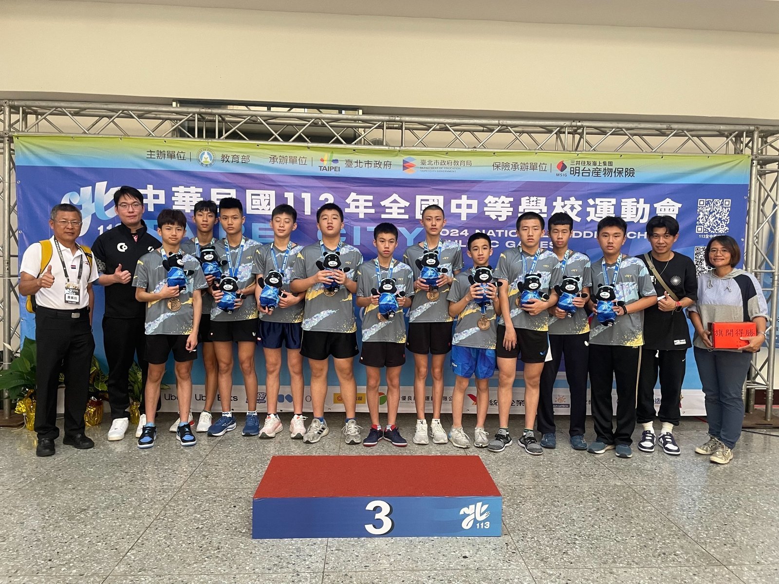 黃偉哲市長表示,忠孝國中國男組單打賽郭冠宏、國女組單打賽陳忞昕兩位同學在去年都無緣四強,這次捲土重來,雙雙挺進冠亞,並且以直落三擊敗對手,獲得113年國中組男、女單打賽冠軍!忠孝國中也在國中組桌球男女混合雙打賽、國男組雙打賽中獲得銀牌,國男組團體賽中獲得銅牌,總計221銅,特別感謝教練、學校以及南市體育總會、南市桌球委員會的辛苦培訓。