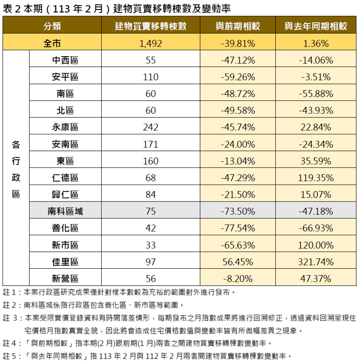 進一步觀察各行政區交易量表現,交易量前三名分別為永康區(242棟)、安南區(171棟)以及東區(160棟)。若與前期相較,因適逢農曆春節期間,多數行政區交易量皆呈現下滑趨勢,惟佳里區因有多棟新建華廈完工交屋,交易量大幅增加56.45%,與去年同期相比交易量亦大幅增加321.74%。觀察南科區域交易量表現,與前期相比雖大幅減少,但與去年同期相比,南科區域之新市區仍大幅增加120%,顯示該區域推案增加、房市交易仍趨熱絡;此外,仁德區因緊鄰高鐵特區,受房價外溢效應影響,交易量與去年同期相比亦有119.35%正成長,後續各行政區間房市發展仍有待持續觀察。