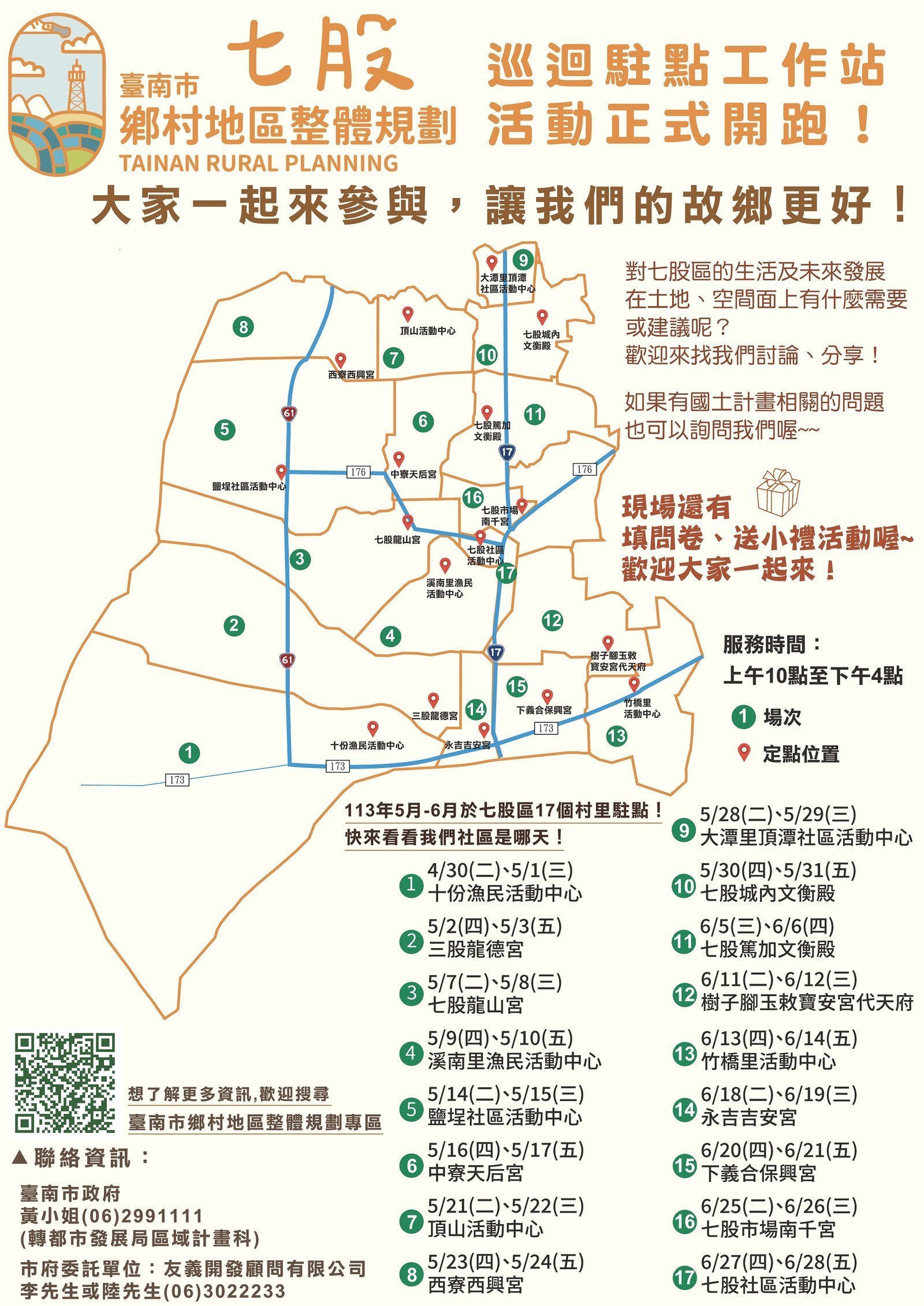 市府都發局說明,七股區巡迴駐點工作站將於4月30日起至6月28日止,於上午10點至下午4點,每個里別將有2場次的定點巡迴服務,為鼓勵民眾共襄盛舉,凡前往駐點工作站填寫簡易問卷的民眾,皆致贈精美實用禮品1組,數量有限!不管您好奇鄉村地區整體規劃在做什麼、或者關心地方發展,皆邀請您停下腳步,與駐點工作人員聊聊,家鄉需有民眾的關心才會更契合地方的需求及期待!詳細系列活動內容請見巡迴場次海報,並持續關注臺南市政府都市發展局臉書以及臺南市鄉村地區整體規劃網頁(https://hometown.tainan.gov.tw)。