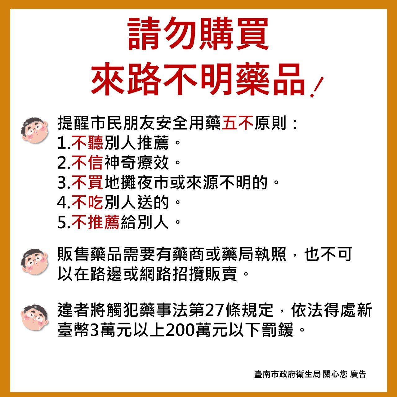 【透傳媒記者杜忠聰/臺南報導】近來不肖業者常於網路或社區兜售來路不明藥品,這些未經審核把關的藥品,擅自服用恐有安全疑慮,不得不慎!