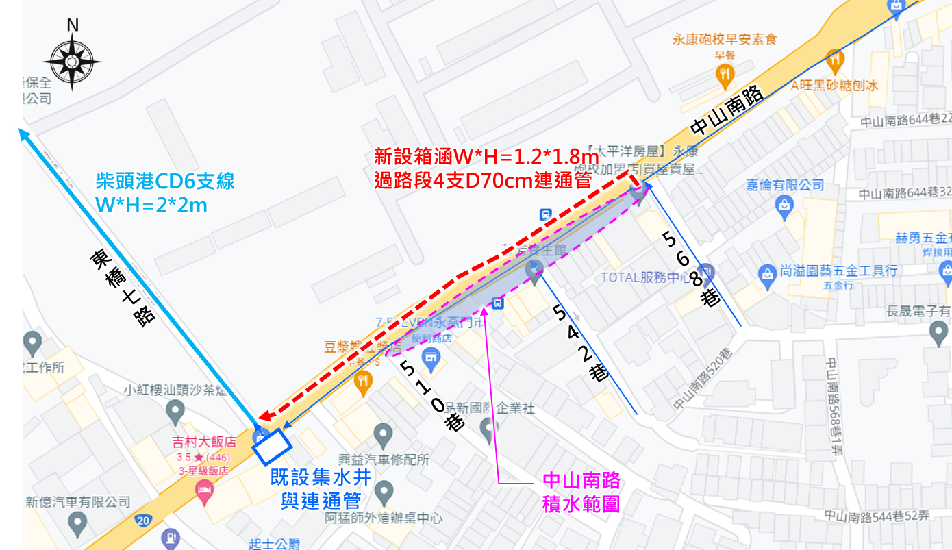 經水利局邀集相關單位協調研商改善方案,並考量中山南路交通流量大且地下管線密布,興建雨水下水道困難度高,經多方協調後,採用側溝式箱涵之改善方案,將於中山南路北側路肩及右轉車道下方,施作箱涵(寬1.2m×高1.8m)長度約為231m,且可兼做道路側溝使用,並於箱涵上游終點(中山南路568巷口)設置4支並排過路連通管,將南側集水區流量匯入北側新設箱涵,藉以改善上游集水區逕流僅依靠南側側溝排放問題。本工程已於今(113)年3月15日開工,工期240日曆天,預計於今(113)年12月底前完工,以期提升區域防洪能力,改善中山南路積淹水情況。