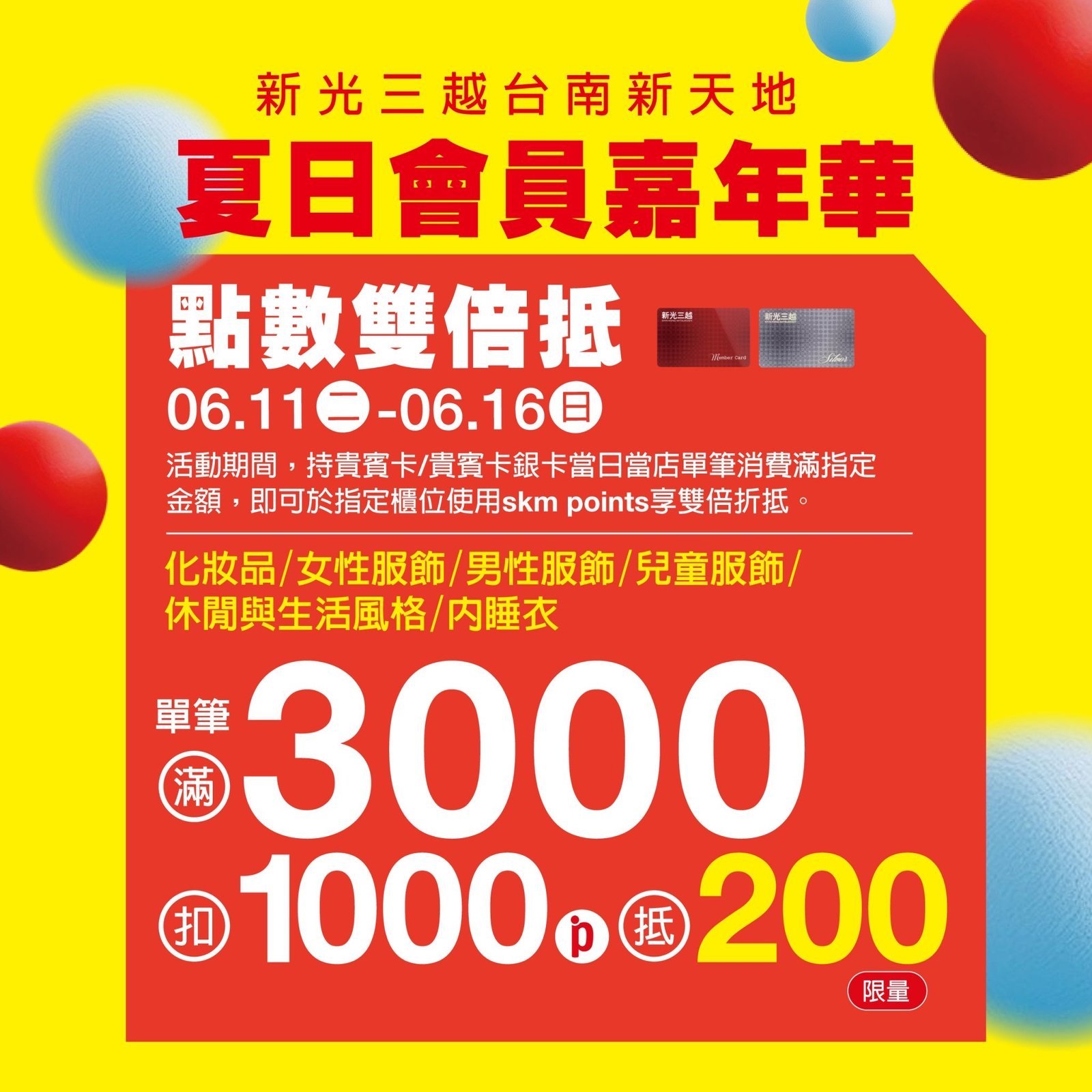 《點數雙倍抵》即日起至6/11(日)限時6天開跑!於指定業種,包括化妝品/女性服飾/男性服飾/兒童服飾/休閒與生活風格/內睡衣/單筆滿3,000元扣1,000點可折抵200元,單筆消費30,000元最高可扣10,000點折抵2,000元!回饋率達6.6%,再搭配6大銀行滿額禮,超狂寵粉回饋,讓顧客越買,回饋多更多!*詳細活動資訊依店內公告為主