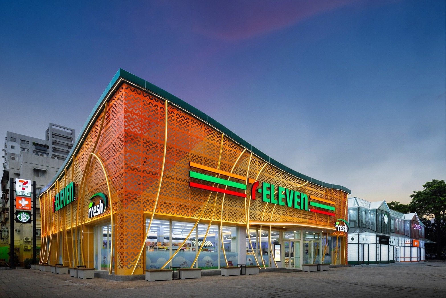 7-ELEVEN「首府門市」外觀以橘色漸層鏤空窗花和金色弧形線條為設計特色,閃耀著不朽光輝,致敬台南古都歷史風華之餘,更期勉統一企業集團永續發展與生生不息的企業精神。門市內融合台南古都風姿雍雅,展演OPEN! 家族全新肖像,亦引入超級市場等多元複合業態,並獨家嚴選展售台南文創專區及在地特色品牌生活選物,更領先業界導入電動車使用的「E-HERO 3移動式充電機器人」,期為城市豐裕底蘊再添活力心情,美好生活由您 OPEN!