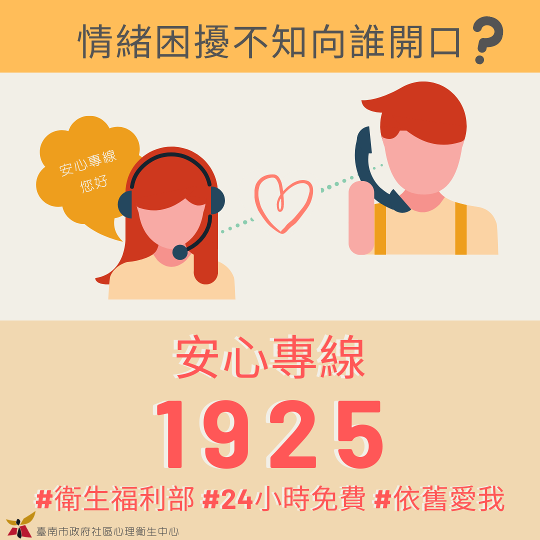 衛生局指出,全市共提供43處免費心理諮商駐點服務,而為了提升全面性的協助與便利性,亦提供晚間諮商時段的服務,藉由讓專業心理師陪伴民眾傾聽讓心情獲得撫慰與支持,使壓力可以找到適當的出口,此外,也可以撥打衛生局預約專線(06)3352982或者衛生福利部提供的24小時免費的安心專線1925(依舊愛我),由專業人員為民眾提供各項心理健康及精神疾病防治等服務,陪伴協助大家共同渡過生活難題,期待能為處於情緒低落時帶來一絲曙光及希望。