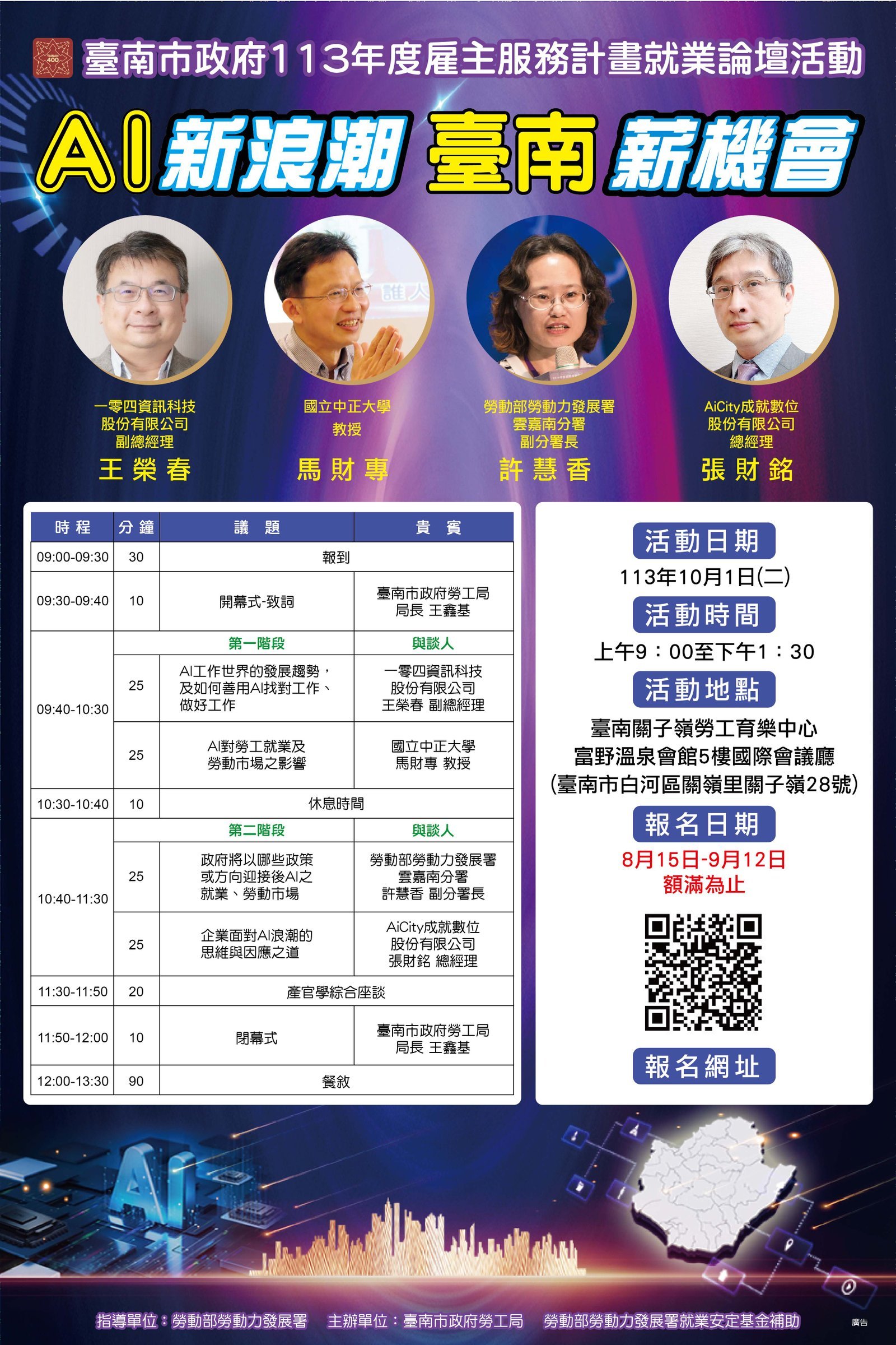 勞工局職訓就服中心梁偉玲主任表示本次論壇活動當天提供免費交通接駁專車,歡迎對「AI新浪潮 臺南薪機會」議題有興趣的市民朋友踴躍報名參加,名額有限,額滿截止,洽詢電話(06)6330820#204,本活動採網路報名,報名網址如下:https://job.tainan.gov.tw/activity/113/forum/,相關訊息公告於臺南市政府全球資訊網https://www.tainan.gov.tw/及臺南市政府勞工局職訓就服中心網站https://job.tainan.gov.tw/ ,歡迎企業廠商及民眾踴躍報名參加。