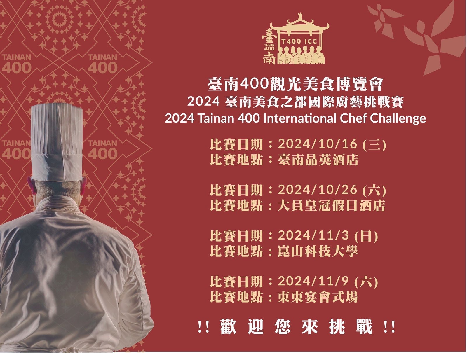 觀光旅遊局表示,「2024臺南美食之都國際廚藝挑戰賽」即日起受理報名,競賽將於10月16日正式起跑,歷時四週、賽事種類多元,每周都有中西式熱烹、藝術烘焙、靜態冷展等不同主題,歡迎各界餐飲好手來臺南發揮創意,展現廚藝與巧思。報名規則及相關資料下載請至「臺南觀光」網站https://ppt.cc/fSseNx或至競賽報名網址:https://www.tainan400th.com/查詢。