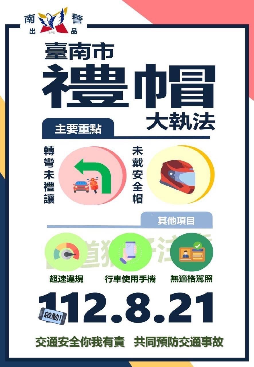 有鑒於此,臺南市政府警察局交通警察大隊除將日前內政部警政署規劃之全國同步執行「路口不停讓行人大執法」列為常態性執法項目外,亦將自112年8月21日推動「禮、帽大執法」,由各分局結合交通事故斑點圖,針對轄區易肇事熱點、路段、時段,及臺南市境內市、郊區等不同區域用路人特性,針對車流量較大或密集之區域以「轉彎未依規定」等不禮讓之違規行為作為執法重點,而近郊地區道路則以「未戴安全帽」作為執法重點,期望在有「禮」又有「帽」的執法策略下,營造一個對用路人「有禮貌」的交通環境,同時輔以常使駕駛人行車分心的「行車時使用手機」以及車輛失控「超速」的違規取締,並加強駕駛人行車時「適格駕照」的審查及取締,希望透過事故數據分析的結果,以精準執法手段,降低事故嚴重程度並防制事故發生。