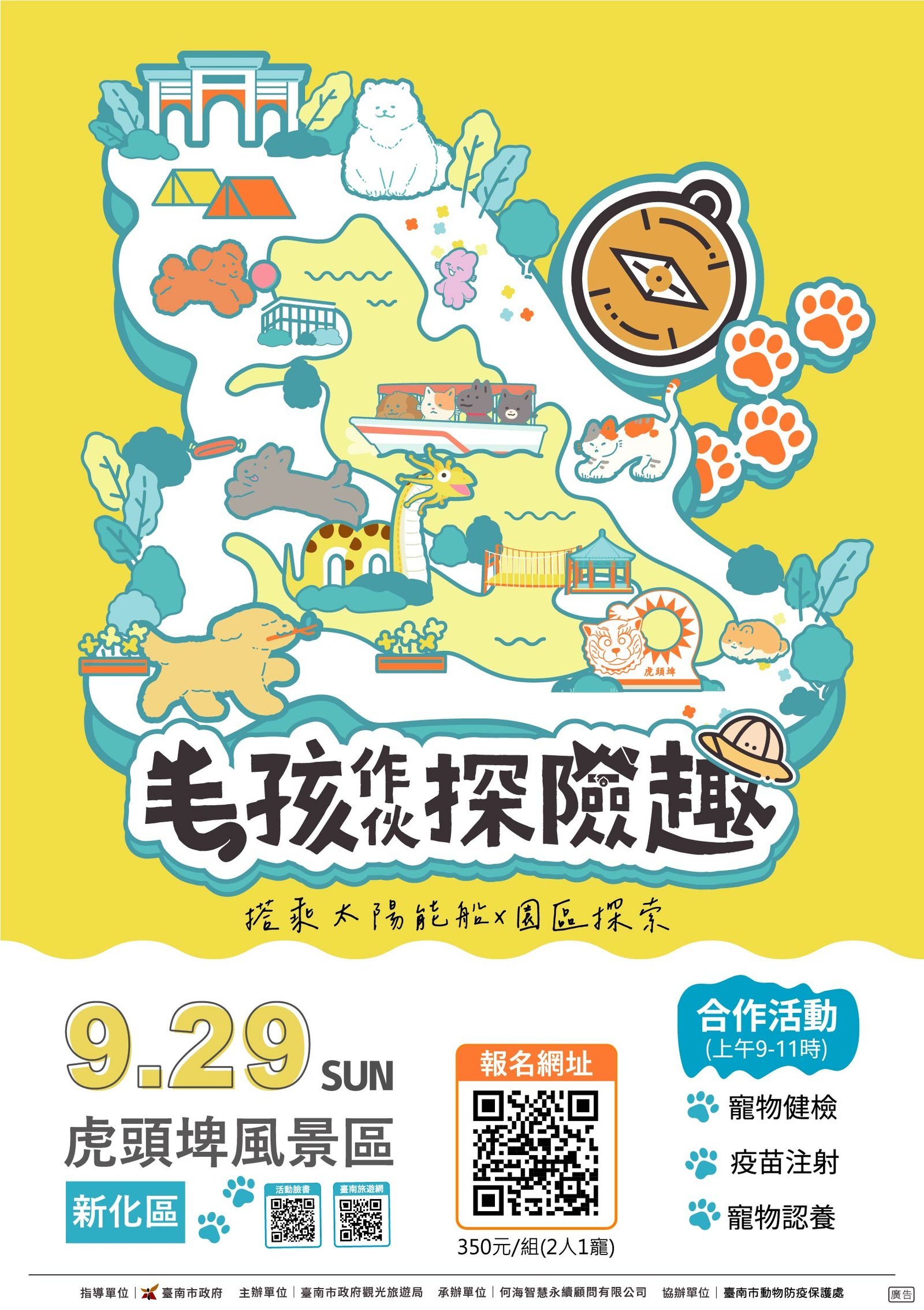 觀光旅遊局林國華局長表示,虎頭埤去年首次舉辦的毛小孩健行活動,吸引許多人參加,今年除了讓大家可以再次帶自家毛孩到虎頭埤漫步,呼吸新鮮的空氣外,更增加了太陽能船體驗,與毛孩一同欣賞水與綠的風光,下了船可與自家毛孩於各活動打卡點拍照,完成太陽能船及折返點探索的朋友還可參加摸彩,另外還有萌寵市集,家長們可以在市集使用折價券參加寵物手足拓印DIY、採購寵物鮮食、寵物零食、寵物似顏繪外,也有提供一般餐飲攤位,此外,上午9-11時臺南市動物防疫保護處也特別在現場提供寵物認養、寵物健檢,寵物疫苗注射、晶片植入等各項免費服務,有吃有玩又可以摸彩,還可以順便幫毛孩做健康檢查,真是十分超值划算,相信會是秒殺的活動,提醒大家快快手刀報名參加!
