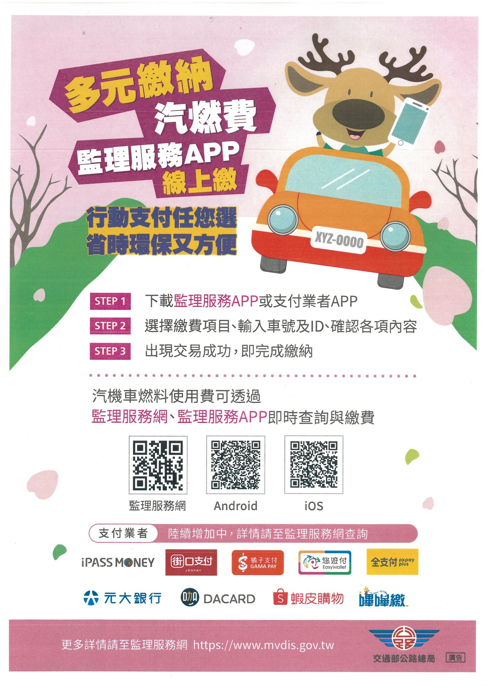 監理機關提供多樣化繳費管道,持單臨櫃繳納汽燃費不再是惟一選擇,民眾可以透過「監理服務網」、手機下載「監理服務APP」、辦理約定扣款或申請電子繳款單等方式繳納,不怕忘記繳款受罰了;但以信用卡繳納者,相關自付手續費金額,請逕洽各發卡行庫。