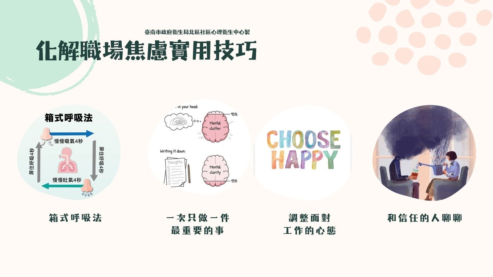 黃偉哲市長提醒市民朋友一起留意在工作職場上的狀態,及早發現問題,轉介醫療資源,也鼓勵市民朋友多加運用衛生局提供43處免付費心理諮商駐點服務,請於上班時間撥打衛生局預約專線(06)3352982。本局成立鹽水區、北區、善化區社區心理衛生中心,諮詢專線鹽水區6521103、北區2510723或善化區5810105,提供市民各項心理健康及精神疾病防治等服務,希望透過專業人員的陪伴,及時地給予幫助,且衛生福利部提供24小時免付費的安心專線1925(依舊愛我),臺南市政府衛生局關心市民朋友長期的職場身心健康。