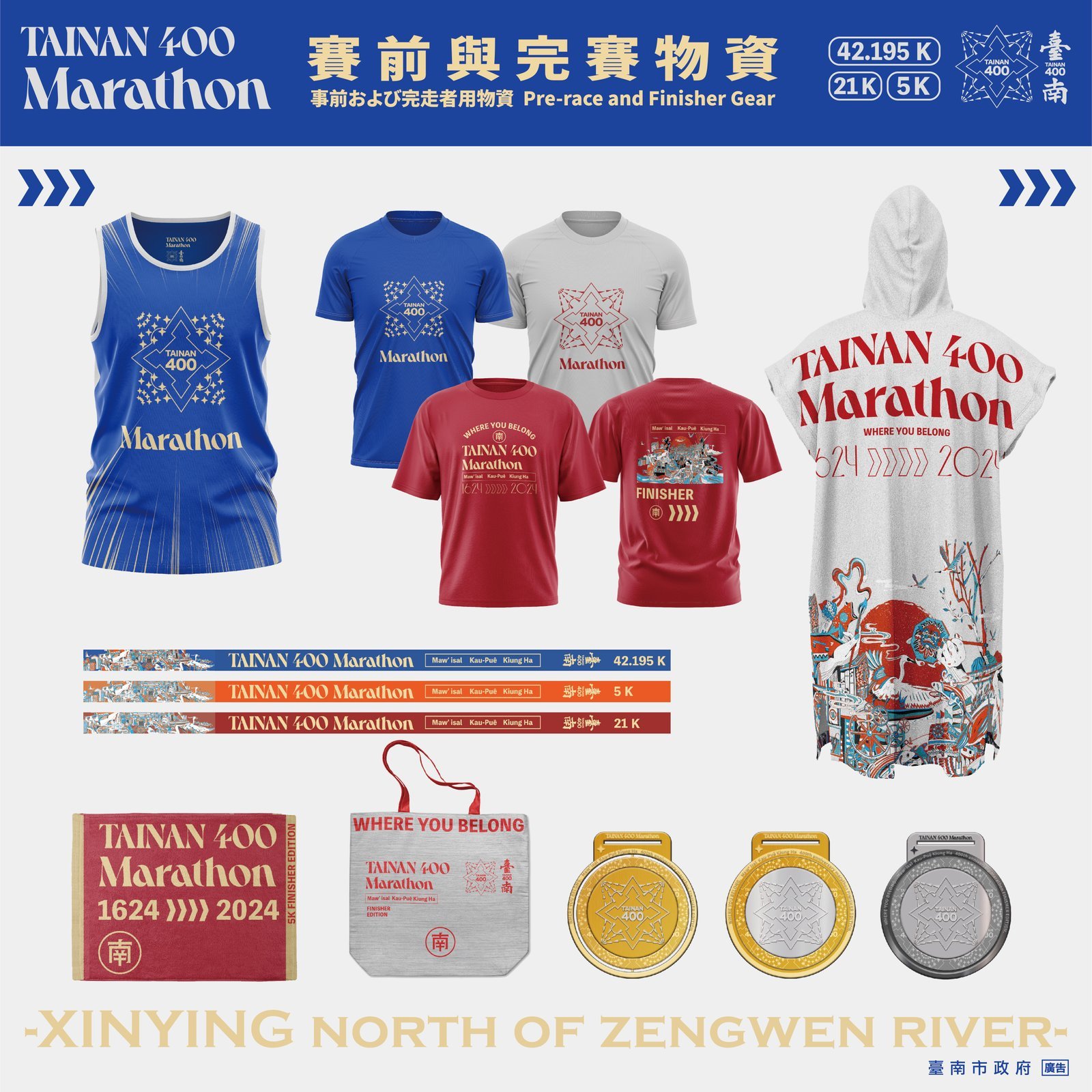 體育局長陳良乾表示,本次主視覺與完賽物資由「數鯤島」與「常形社」共同設計繪製,充滿設計質感的完賽物資包含紀念跑衣、紀念棉T、完賽獎牌、完賽斗篷、完賽毛巾與完賽物資袋等,種類十分豐富。除了精緻的完賽物資,本次賽事獎金總額也上看400萬元,其中臺南400馬拉松組總排第一名更可得獎金12萬元,歡迎所有熱愛路跑的朋友踴躍報名參與,豐厚的獎金讓大家跑完五營擱有贏。