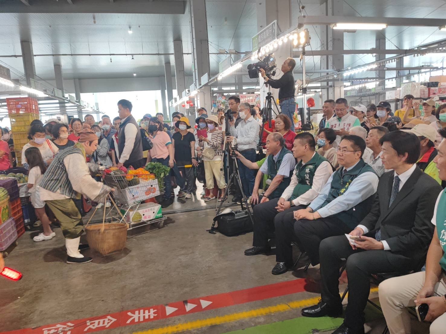 市長黃偉哲親臨現場,表示新化果菜市場自搬遷至現址以來,規模擴大近50%,市場空間挑高,通風與照明條件優良,翻轉了人們對傳統果菜市場的印象,成為參觀選購臺南優質農產品的理想場所。感謝農業部補助本次臺南400年的表演活動,本次活動不僅結合了新化果菜市場二周年慶典,還有農特產品市集以及風景區門票贈送等豐富內容,期望遊客在參與農漁地景藝術節的同時,能深入新化區各地旅遊,促進地方觀光產業發展。