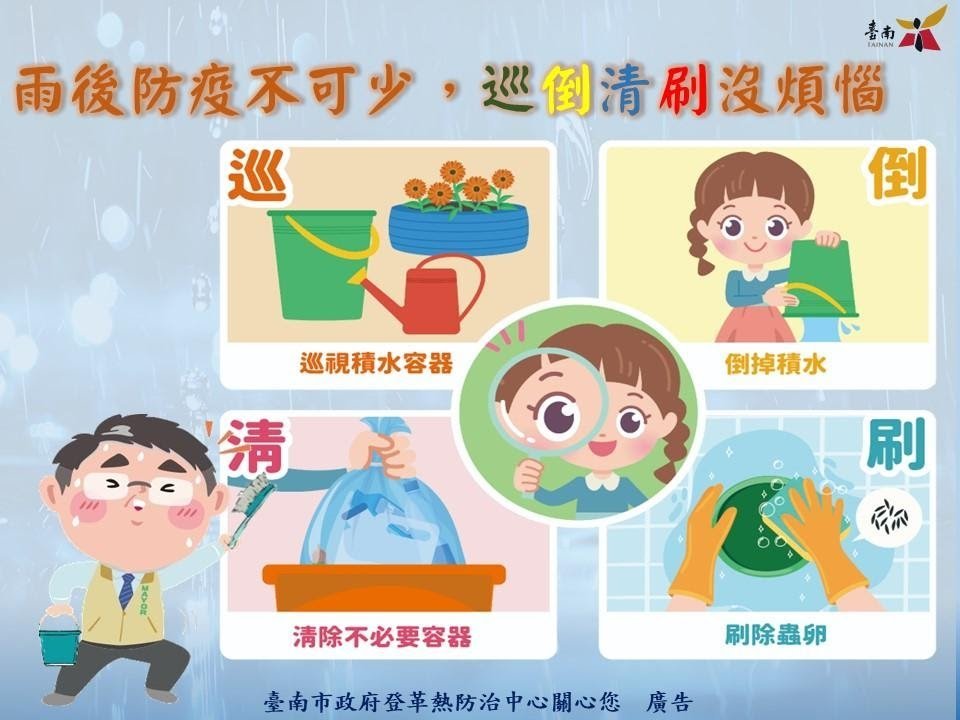 為強化登革熱防疫,貫徹公權力執行,本局公告「臺南市登革熱/屈公病防疫措施」, 113年4月1日起至12月31日止,本市公、私場所之所有人、管理人或使用人應主動清除場所內之登革熱病媒蚊孳生源,如查獲病媒蚊孳生源,依傳染病防治法第25條規定開立舉發單,並依同法第70條處3,000-15,000元罰鍰,無改善期,呼籲民眾平時及雨後,落實場所戶內外環境「巡、倒、清、刷」,維護環境衛生及居民健康。