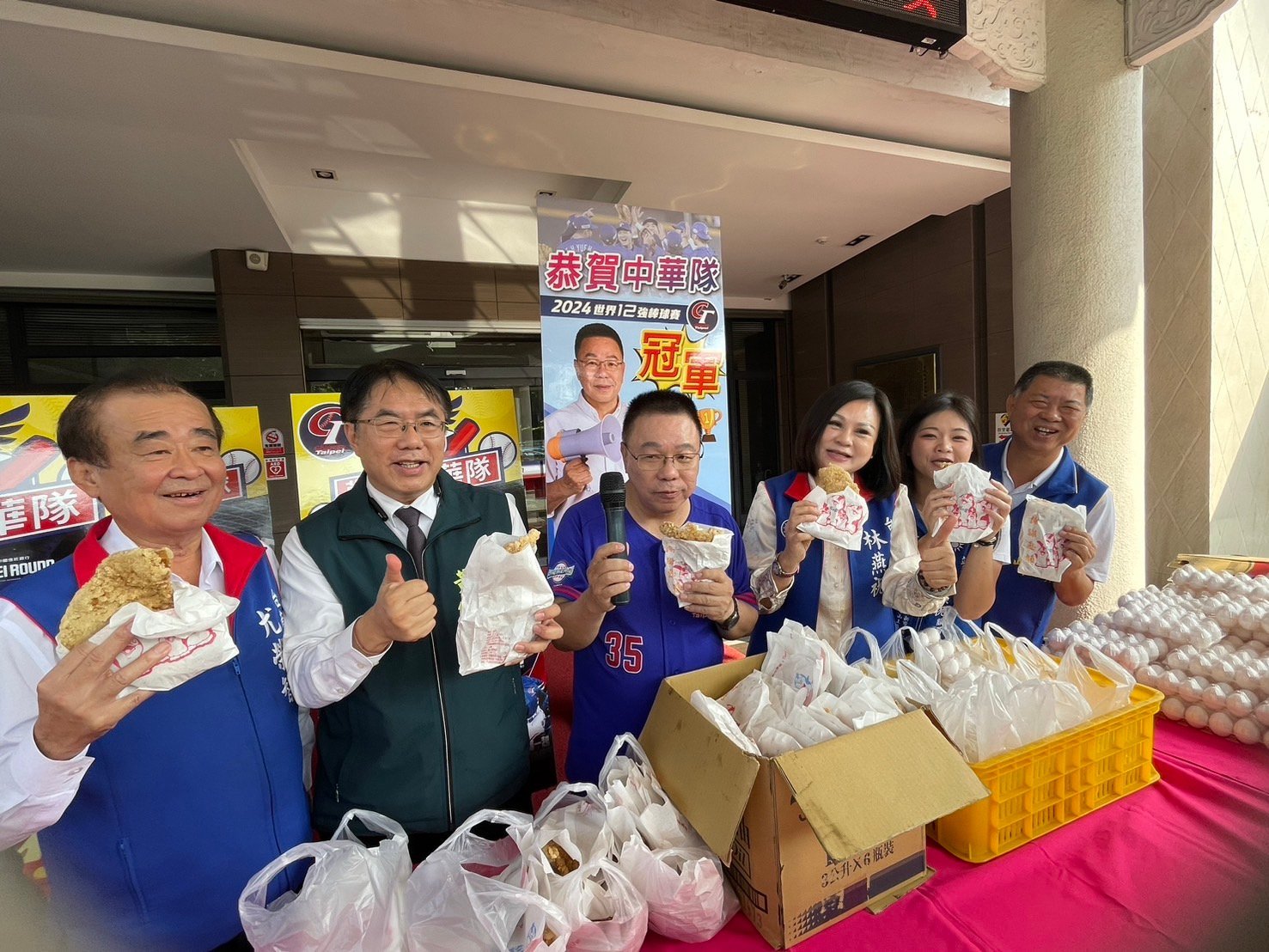 【透傳媒記者杜忠聰/臺南報導】中日大戰4:0完封勝!資深球迷的台南市議會國民黨團發言人蔡育輝,之前承諾不論輸贏都發放雞排和雞蛋,看到中華隊凝聚國人棒球魂的精采表現,今天跟尤榮智、方一峰、林燕祝議員,齊聚新營民治議事廳,發放雞排豬排等美食,連市長黃偉哲都共襄盛舉,從300份一直加碼到2150份,現場熱鬧氣氛宛如歡樂的嘉年華會,藍軍議員們更不忘再次跟賴清德總統喊話,請讓亞太棒球村成為棒球國訓中心!
