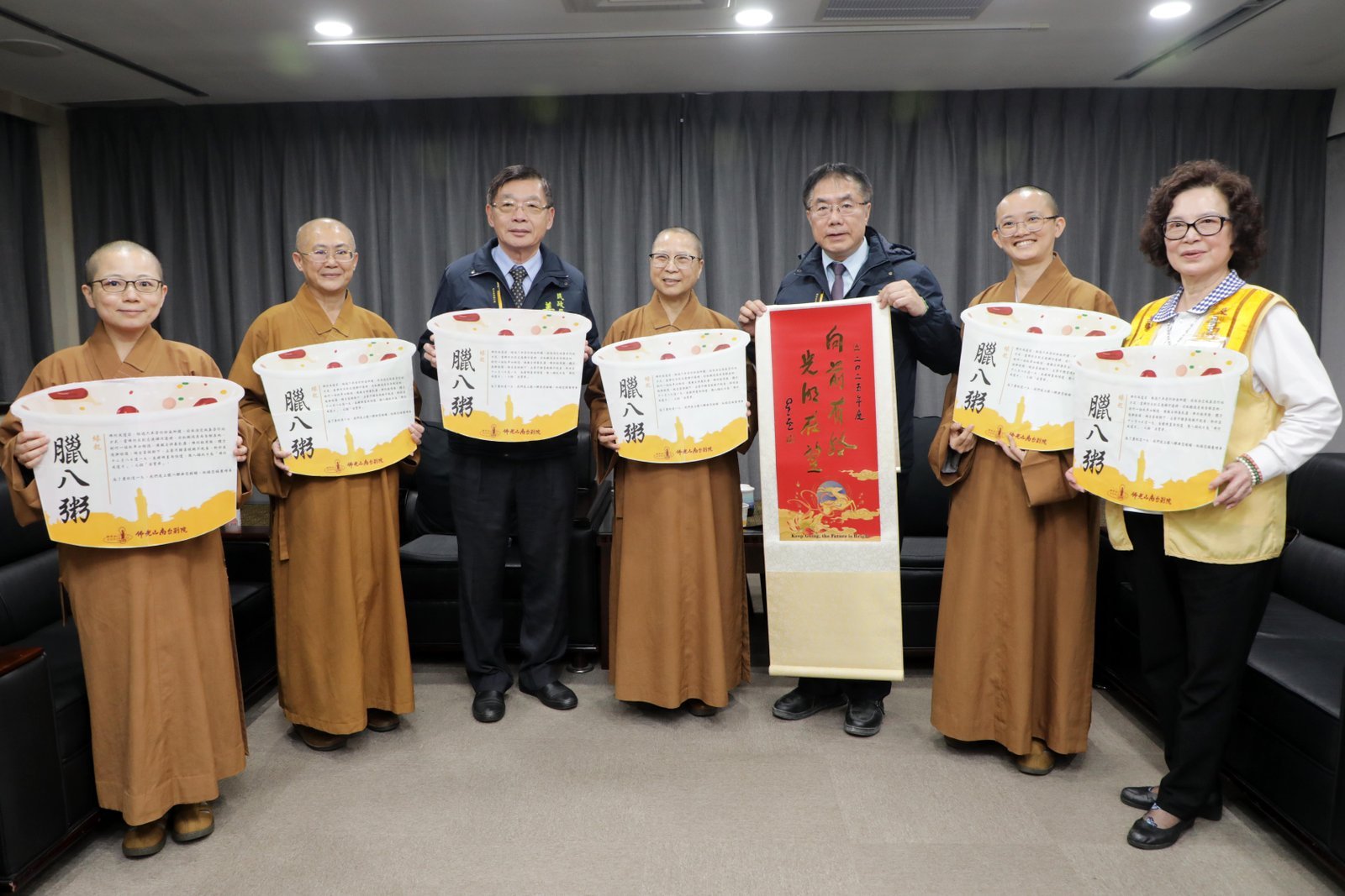 【透傳媒記者杜忠聰/臺南報導】為慶祝農曆12月8日的佛陀成道日,佛光山南台別院每年準備佛粥(臘八粥),除在道場供應禮佛信眾外,還分送政府機關、公司行號及弱勢團體等單位,7日南台別院住持滿舟法師親送臘八粥及春聯「向前有路 光明在望」至臺南市政府與市長黃偉哲分享,黃偉哲也回贈臺南農特產品,且對於佛光山長久以來對臺南社會福利的重大貢獻致上謝意。