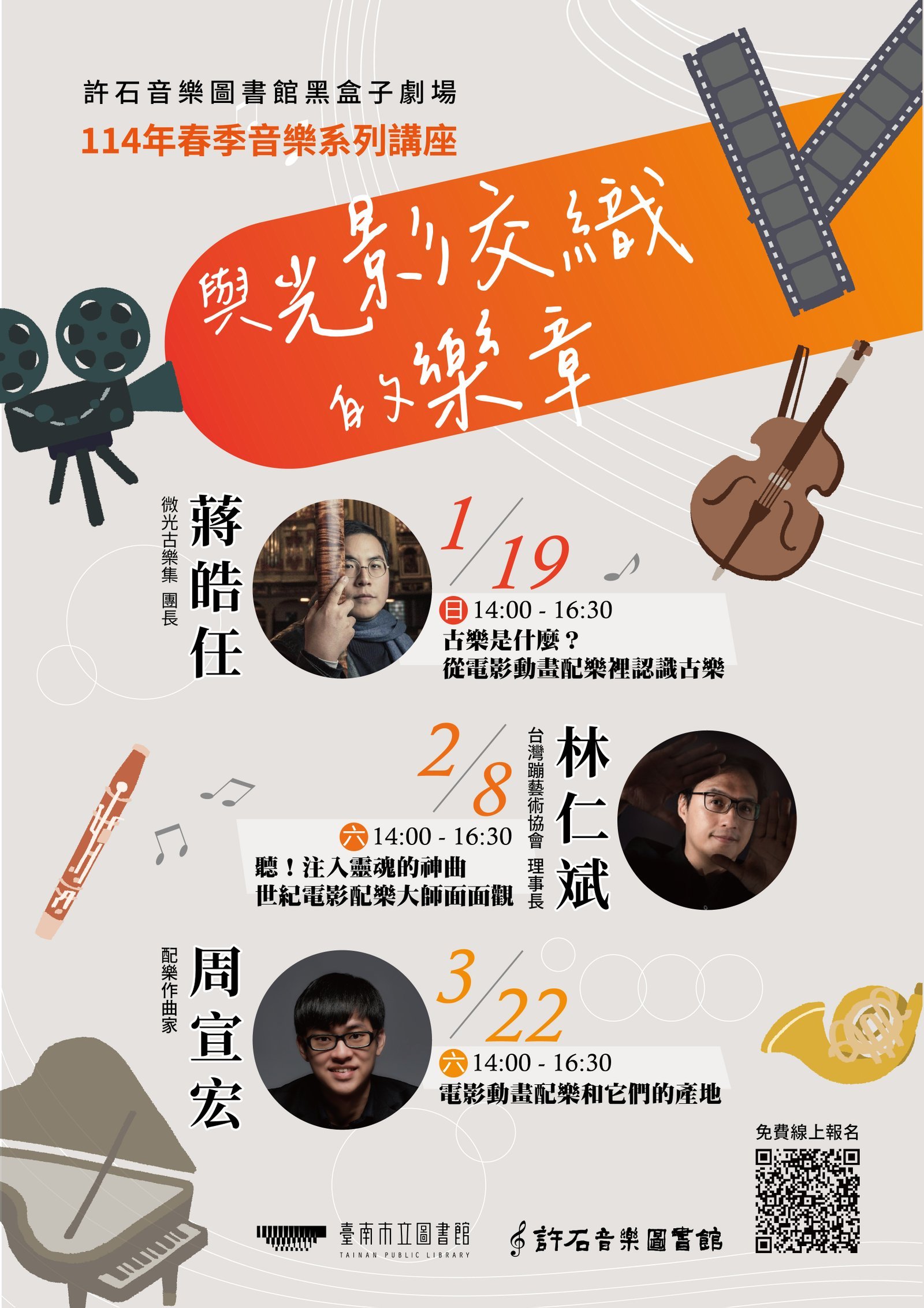 南市圖說明,首場講座將於1月19日(日)下午2點搶先登場,邀請微光古樂集團長蔣皓任,透過他對古樂器與古樂歷史發展的專業知識,解析古樂如何成功塑造獨具特色的電影氛圍;第二場於2月8日(六)下午2點,由身兼長笛演奏家與臺灣蹦藝術協會理事長的林仁斌主講,藉由他深入西方電影配樂數十年的歷程,探討漢斯·季默、顏尼歐等世紀配樂大師如何透過音樂塑造經典電影的精彩時刻;第三場則於3月22日(六)下午2點,邀請現任高雄市管樂團駐團作曲家周宣宏帶領讀者,賞析美國與日本電影動畫配樂的風格與特色,欣賞坂本龍一、久石讓等名家的傑作。三位講師在音樂領域皆擁有豐富的講座經驗,專業陣容結合不同電影經典案例的解析,讓參與者可以一探配樂世界的多樣性與美妙之處。