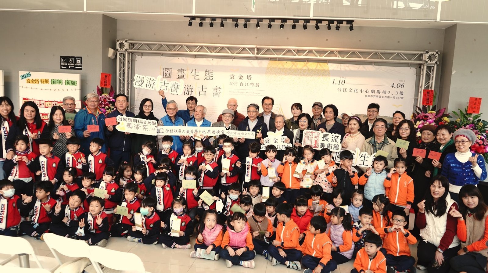 【透傳媒記者廖蓓慈/臺南報導】水墨藝術大師袁金塔2025年台江特展「圖畫生態˙漫游古書」於1月10日(五)在台江文化中心隆重開幕。文化局林韋旭代理局長以及協辦單位臺疆祖廟大觀音亭暨祀典興濟宮以及台南應用科技大學美術系等單位貴賓與會,安南區公所、民意代表以及台江在地文史工作者等單位代表也一起共襄盛舉。開幕現場還特別邀請台江文化中心鄰近的康橋幼兒園、愛因斯坦資優幼兒園小朋友,在袁金塔特製的手工紙新年祈福卡上,寫下新年新希望,童言童語十分可愛。