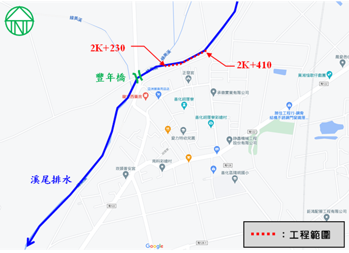 水利局說明,溪尾排水為善化區主要排水系統,其主流下游起自與曾文溪匯流點,上游迄至善化區東勢寮附近之鐵路涵洞,主流長度約10公里,且現況仍有多處護岸尚未整治。近年來,極端氣候影響日益嚴峻,短延時強降雨事件頻繁發生,導致災害範圍和程度較以往更為嚴重。其中,溪尾排水2K+230~410左岸鄰近善化區胡厝寮聚落,經過水利局巡查檢視發現部分護岸已有崩落現象,亟需辦理護岸整建工程。