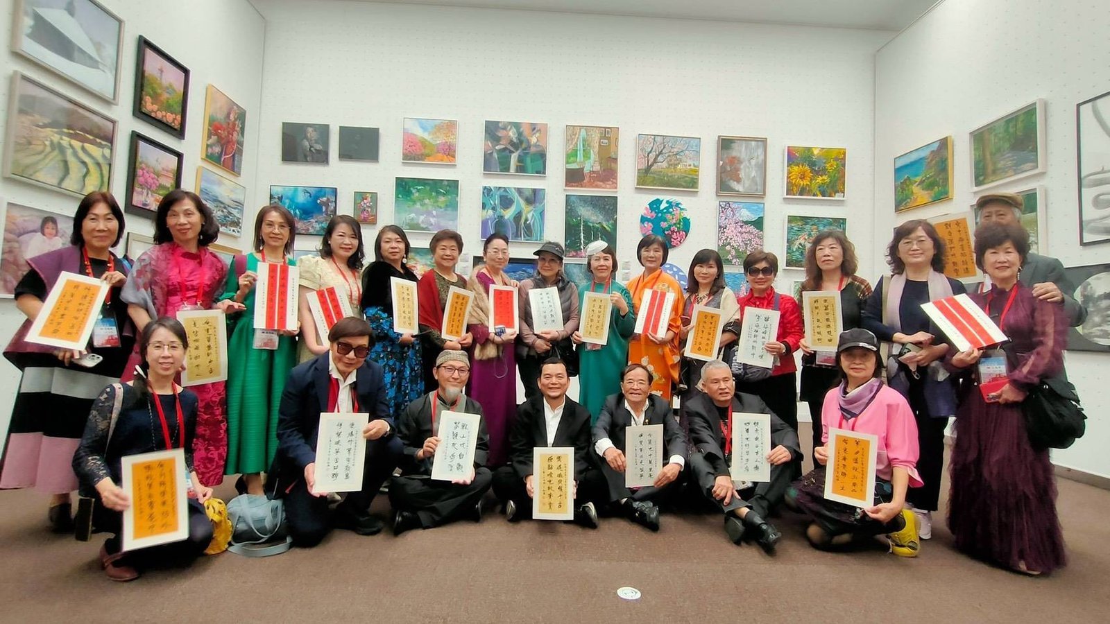 台灣代表團在展覽中的表現尤為亮眼。由藝術家陳炳臣擔任佈撤展主委,理事長李銘煌擔任副主委,巧妙運用有限的空間,營造出大氣而富有藝術氛圍的展覽區域,成為全場焦點之一。此外,李銘煌理事長特別準備了客製化嵌名聯作書法,贈送給每位參展藝術家;而會長李正輝則以別具意義的紅包,內含其百歲母親的簽名$100,祝福每位藝術家福祿壽喜財運發。