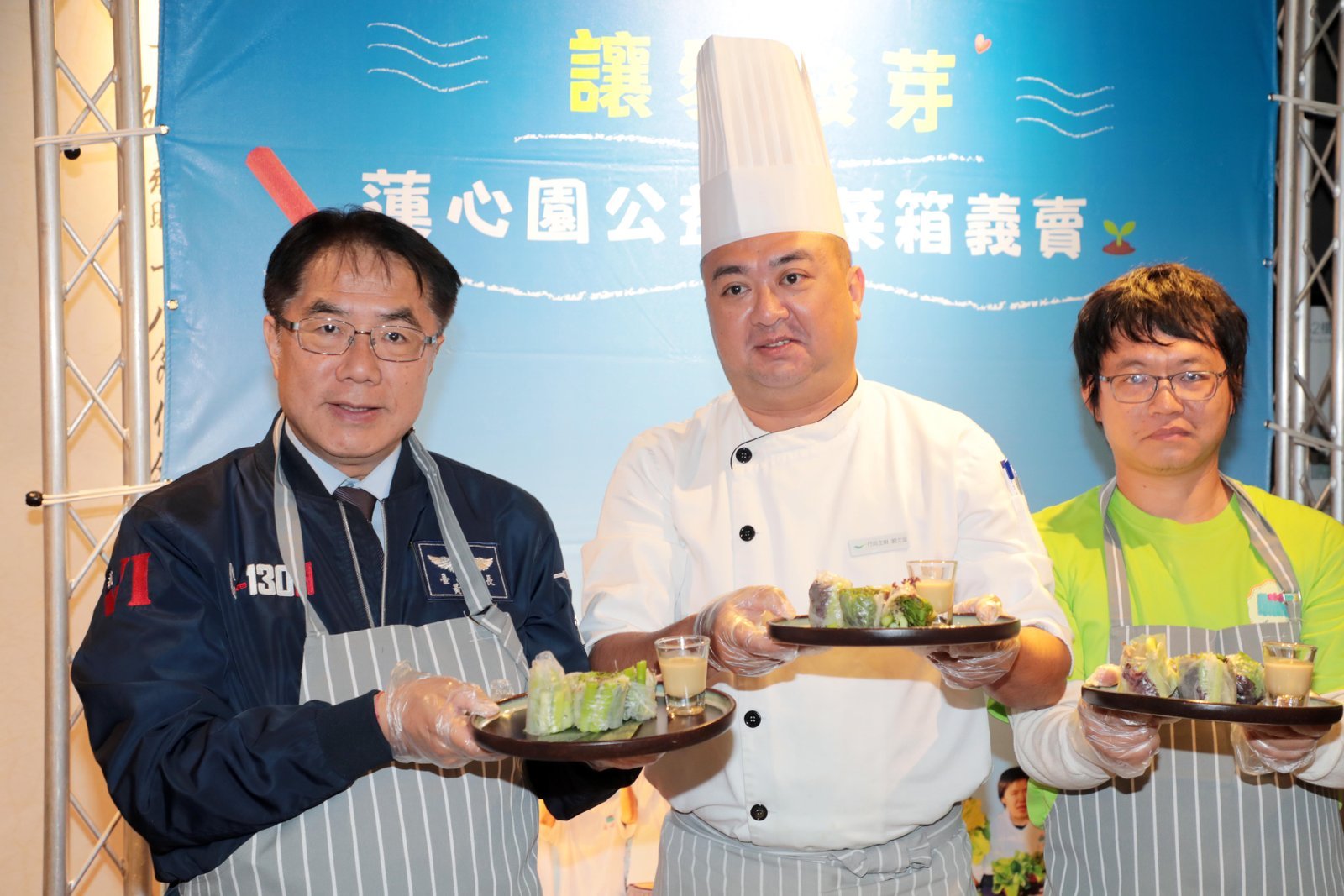 饗賓集團去年與臺南市政府合作啟動影音數位行銷,與憨慢孩子共同拍攝料理節目,推廣蓮心園庇護農藝工場的農產品。今日於饗食天堂臺南西門店現場不僅擺設蔬菜箱協助義賣,也安排黃偉哲市長與主廚、庇護員工一同製作有機生菜捲餅教學。饗賓集團饗食天堂督導林佳蓉、饗賓集團總經理室資深經理戴菀伶、蓮心園基金會張田黨董事長偕夫人、蓮心園庇護農場場長曹代明皆出席活動,邀請消費者多多選購支持。
