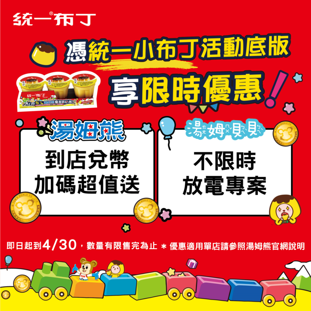即日起憑統一小布丁三入組活動底板,至全台指定湯姆熊或湯姆貝貝(二擇一)就能享超值優惠,讓布丁控們邊吃邊玩、開心加倍!