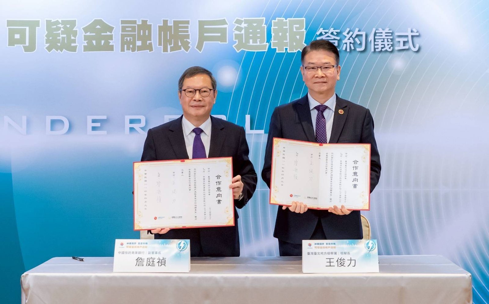 臺北地檢署檢察長王俊力特別提及,公權力結合金融專業,能提前掌握犯罪手法,也能達到強化嚇阻的作用。臺北地檢署看好中信銀行於阻詐的努力,除了已經合作的「雷霆專案」外,「可疑金融帳戶通報機制」的加入,可自犯罪前端即時攔截,讓不法行為無法得逞,簡化繁複的司法程序,節省寶貴資源。