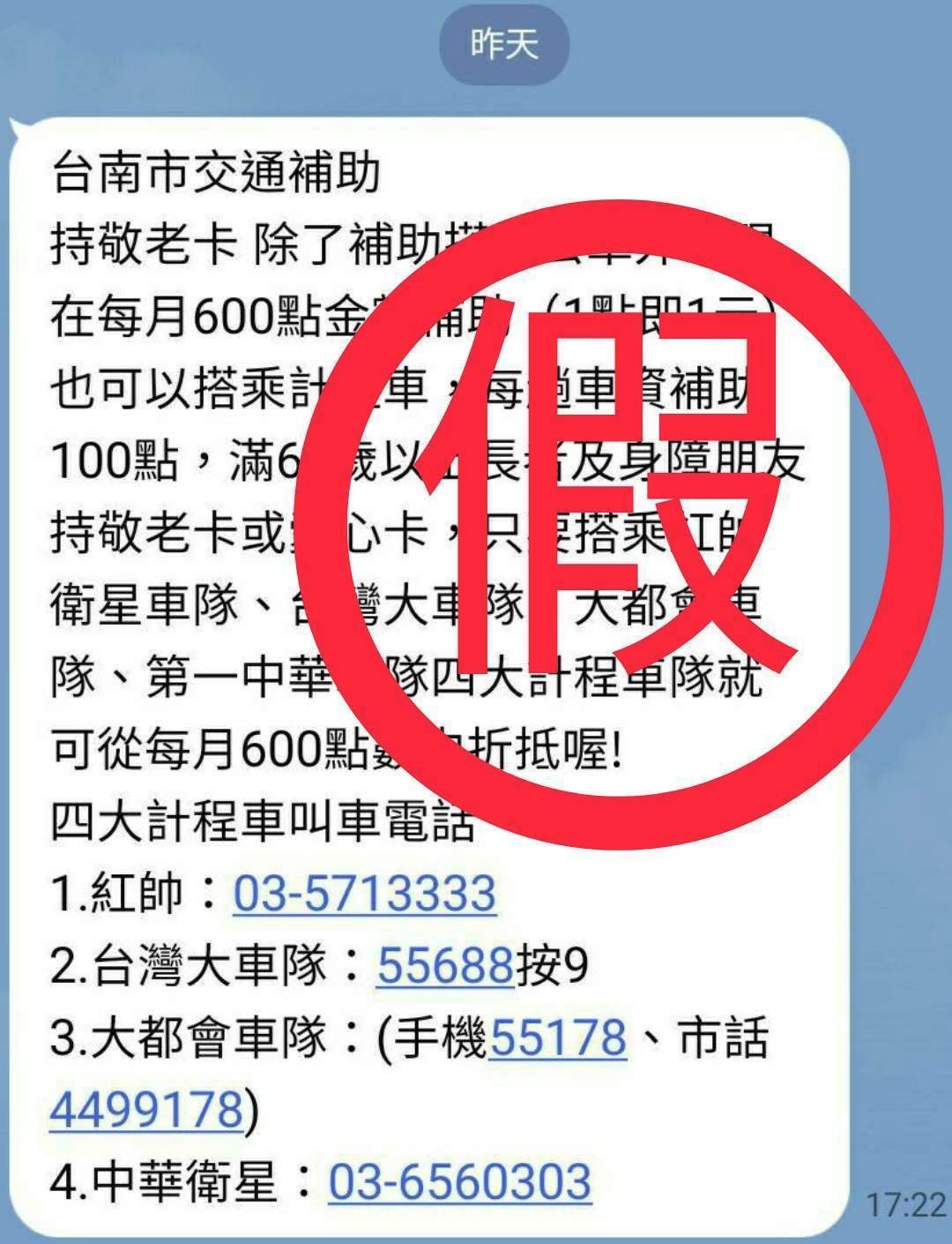 【透傳媒記者杜忠聰/臺南報導】臺南市政府社會局指出,近期LINE流傳一則不實訊息「台南市交通補助,持敬老卡 除補助搭乘公車外,每月600點金額補助(1點即1元)也可以搭乘計程車,每趟車資補助100點,滿65歲以上長者及身障朋友持敬老卡或愛心卡,只要搭乘四大計程車隊就可從每月600點數中折抵……」。社會局澄清,臺南市現行敬老卡搭乘本市公車及小黃公車皆為免費無限次數搭乘,另搭乘外縣市公車、捷運及輕軌等大眾交通運輸工具亦可享有半價優惠,並不能用於搭乘計程車,社會局提醒長輩切勿受騙上當,也不要轉傳或散布不實訊息。