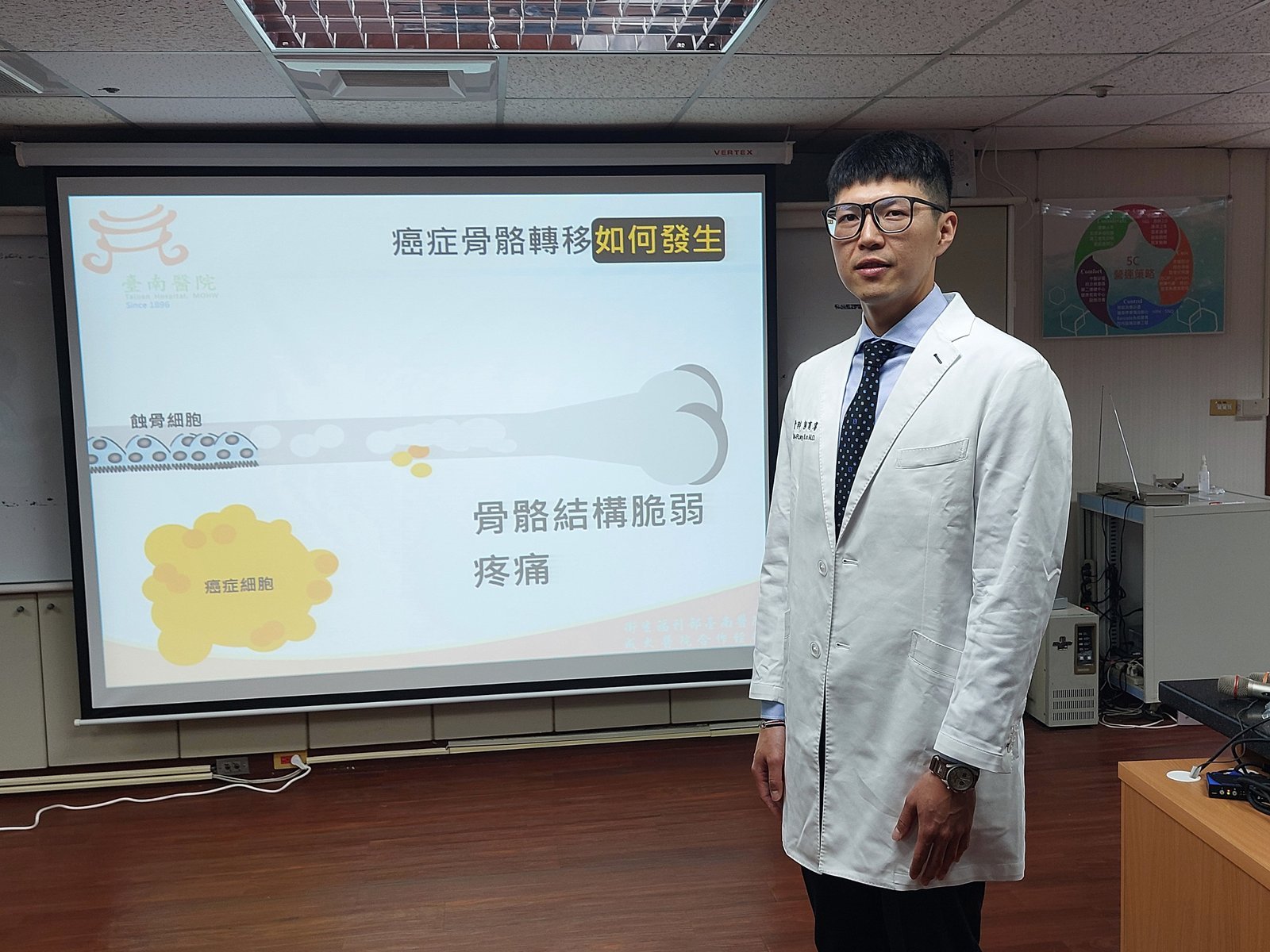部立臺南醫院骨科主治醫師郭育睿表示,癌症患者有相當高的機率發生癌細胞轉移到骨骼的風險,國人常見的癌症如乳癌、攝護腺癌、肺癌、腎臟癌及甲狀腺癌都有相當高轉移到骨骼的風險,然而因為相關症狀常被誤以為是一般的痠痛,往往導致患者延誤就醫,等到骨折才被發現癌細胞已轉移到骨骼,不僅增加治療難度,也影響生活品質。