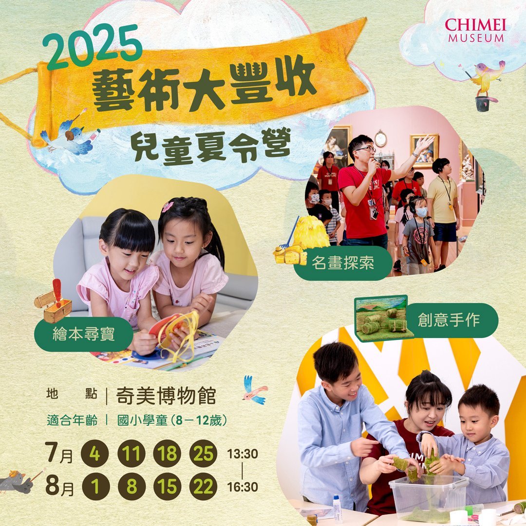 2025「藝術大豐收」兒童夏令營將於7、8月每週五下午13:30至16:30舉行,對象為8至12歲兒童,每場次上限15位。營隊費用內含3小時活動學費、《My Harvest Journey我的大豐收─畫作尋寶祕笈》立體童書、活動教具與創作材料,並贈送2張奇美博物館常設展全票(價值400元)。報名費用原價2,500元,5/12至6/15推出早鳥9折優惠2,250元。報名請洽ACCUPASS 活動通https://reurl.cc/M369jk詳情請上奇美博物館官網:www.chimeimuseum.org