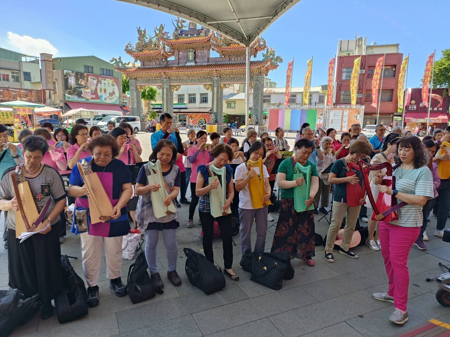 【透傳媒記者廖蓓慈/臺南報導】為慶祝府城建城 300 週年,南華大學民族音樂學系豎琴老師劉貞宜,於 17 日上午率領 70 位平均年齡 70 歲的資深府城人,在安平開台天后宮、安平古堡及金小姐雕像前,舉行《府城 300 – 陶豎快閃安平三部曲》活動。